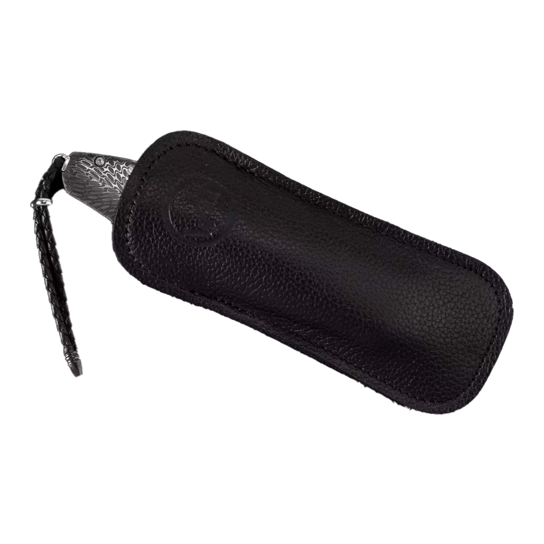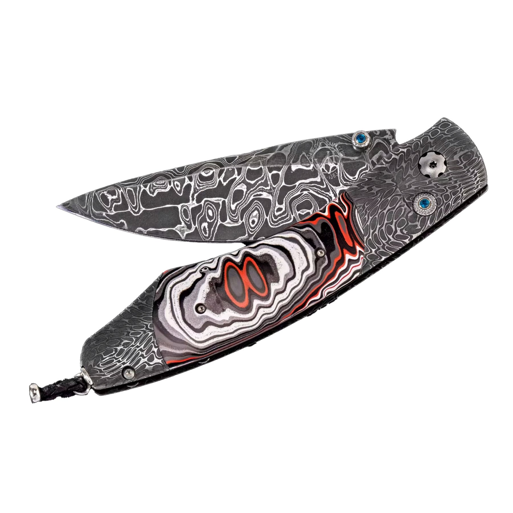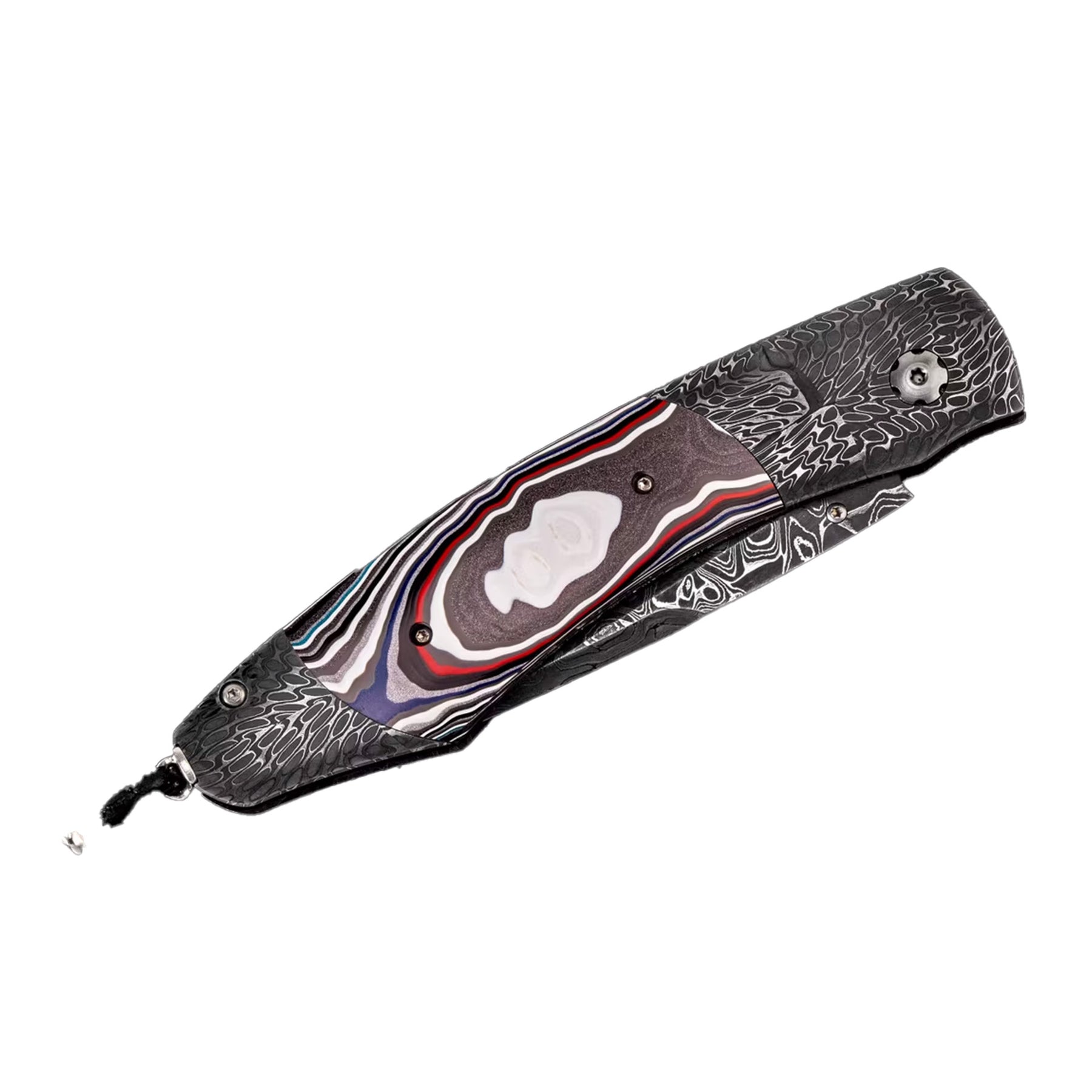 The Spearpoint ‘V-8' features a mesmerizing frame in hand-forged 'River Rock' damascus by Chad Nichols, inlaid with Fordite (aka 'Motor City Agate'). The blade is hand-forged 'Intrepid' damascus steel by Chad Nichols; the one-hand button lock and the thumb stud are set with black onyx cabochons. A remarkable design that gives you an instrument with a full-size secure grip, and a versatile deep-belly blade, the Spearpoint epitomizes William Henry’s core philosophy – that superlative function deserves to be elevated to superlative art. The ‘V-8’ features some of the most exotic materials, artistry, and hand-forged metals that are the hallmark of William Henry's collections; a timeless heirloom to be proudly carried and used for a lifetime before being handed-down to another generation.