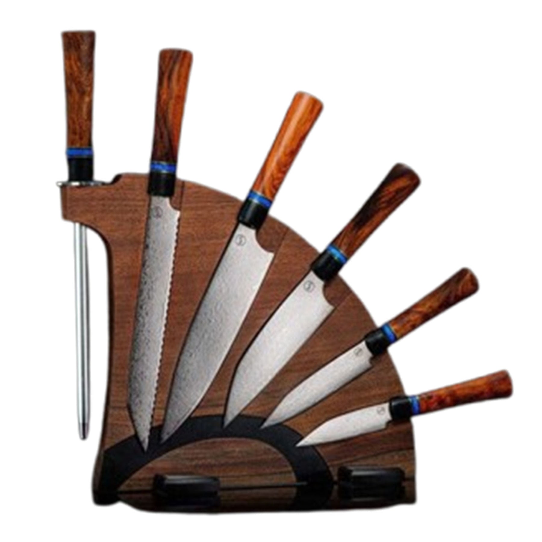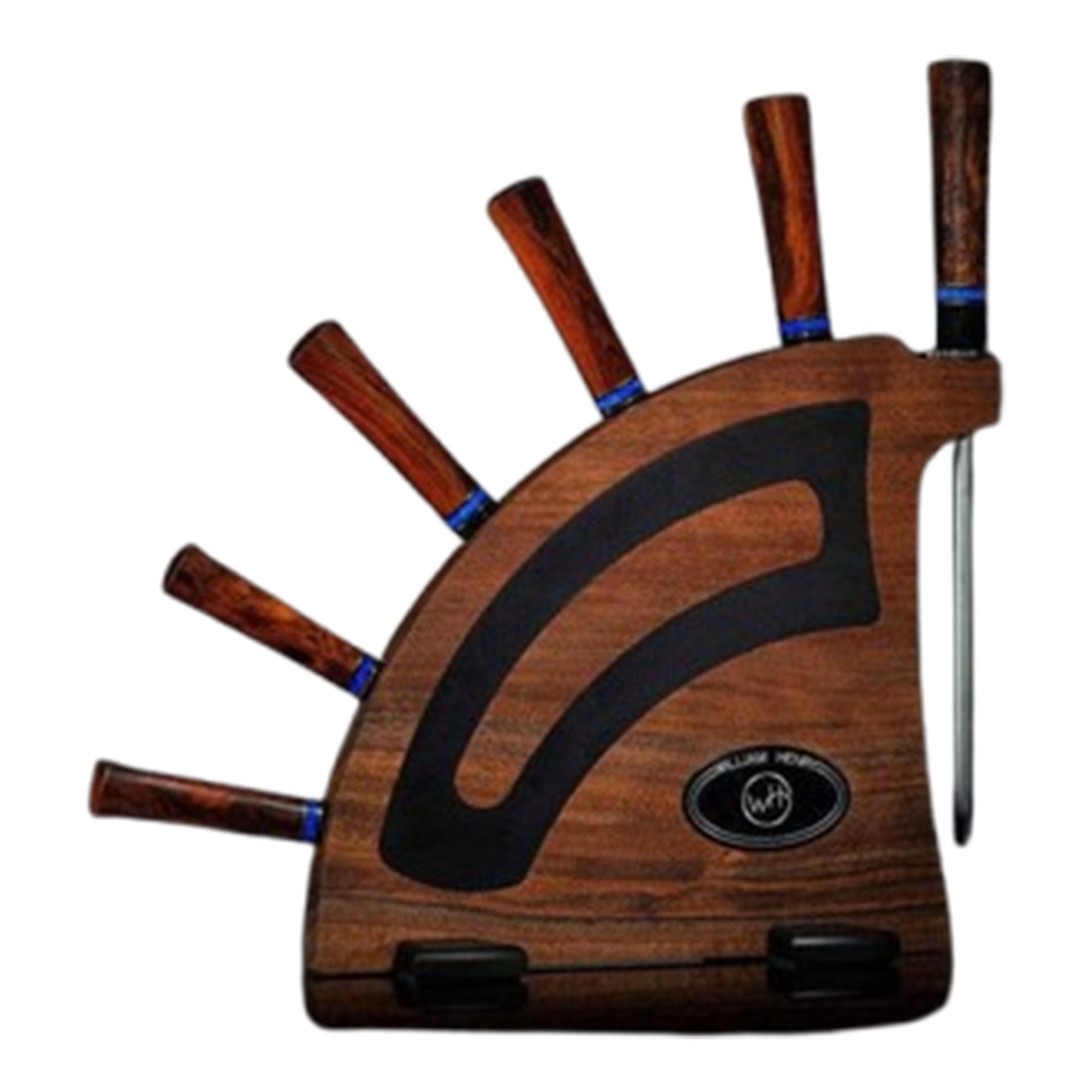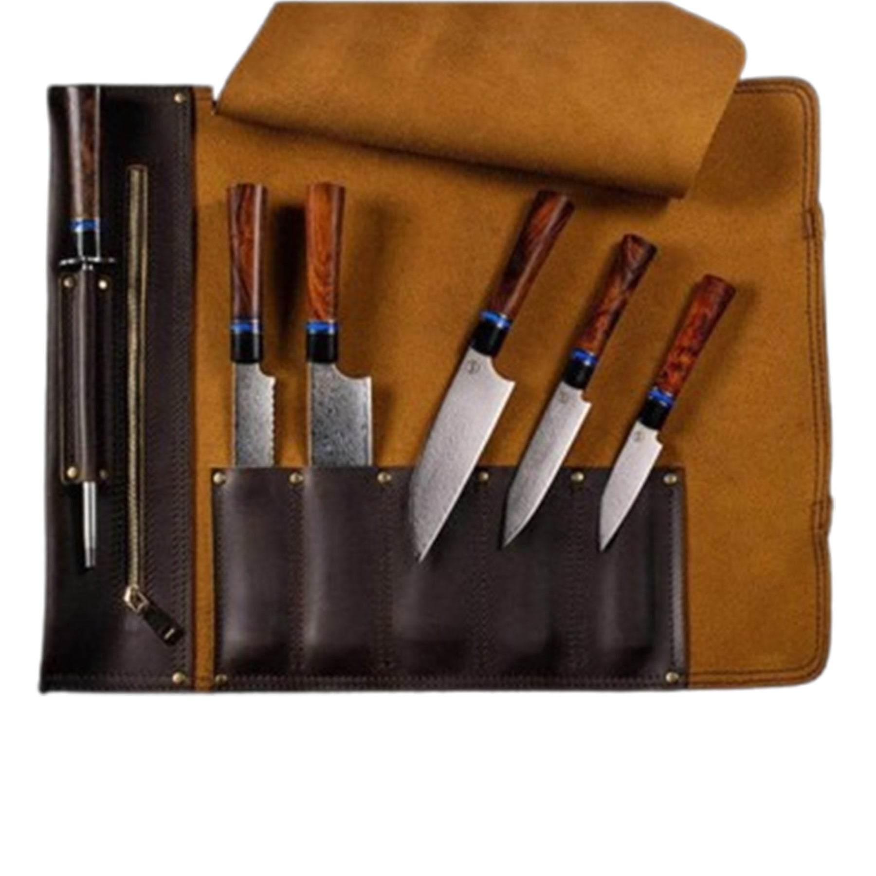 Five culinary knives with damascus blades and ironwood handles detailed with black Micarta and Turquoise, diamond-coated sharpener, walnut display with laminate inlays, rare earth magnets, aluminum feet, engravable stainless-steel logo-plate, leather bag with blade protectors.