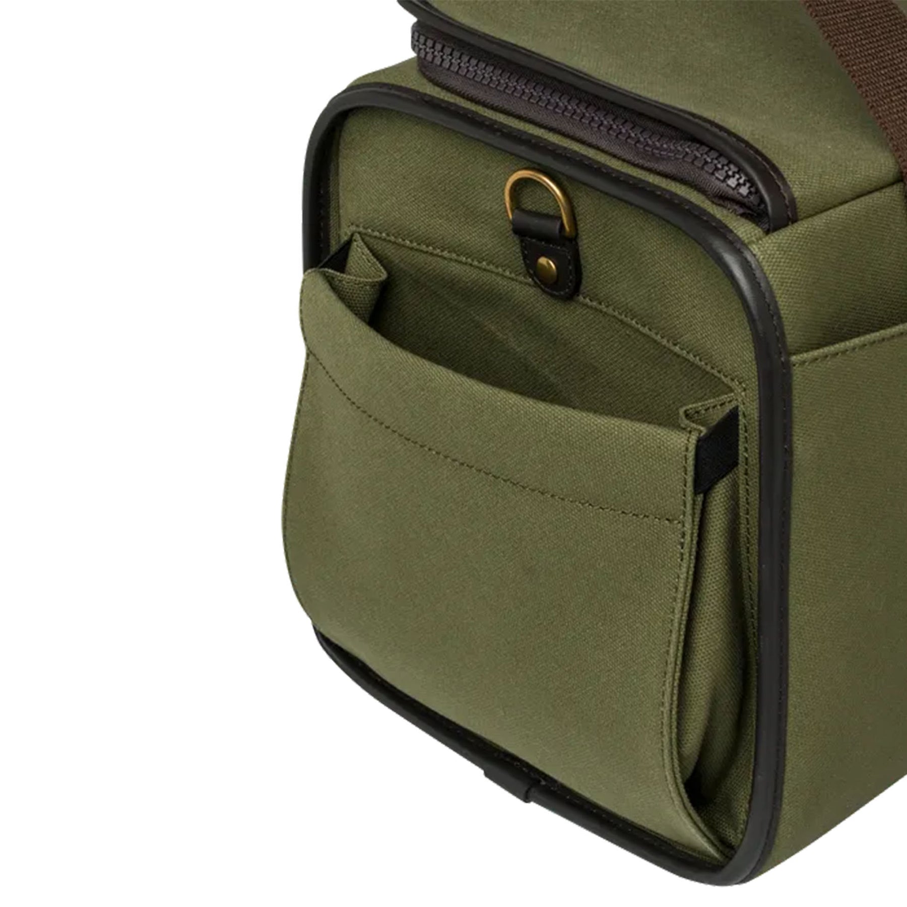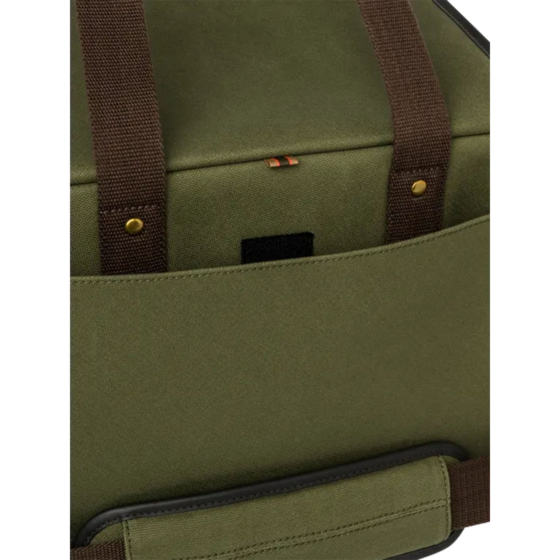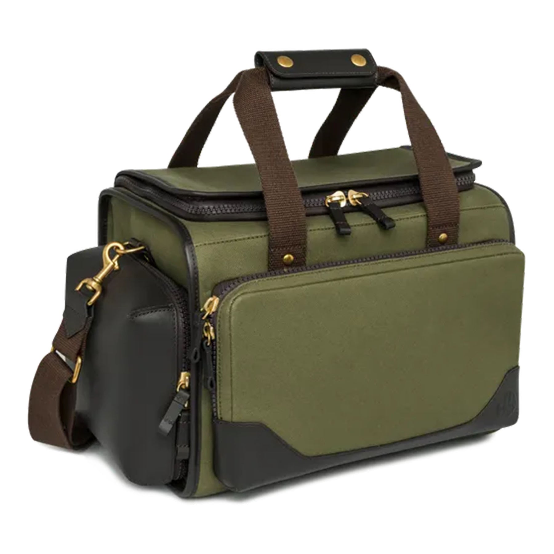 Field bag ideal for both clay shooting and hunting. Made of durable canvas with leather details, it is designed to carry approximately 150 cartridges.