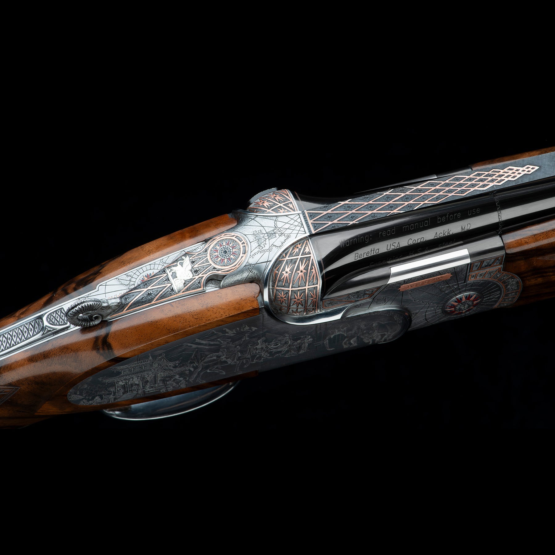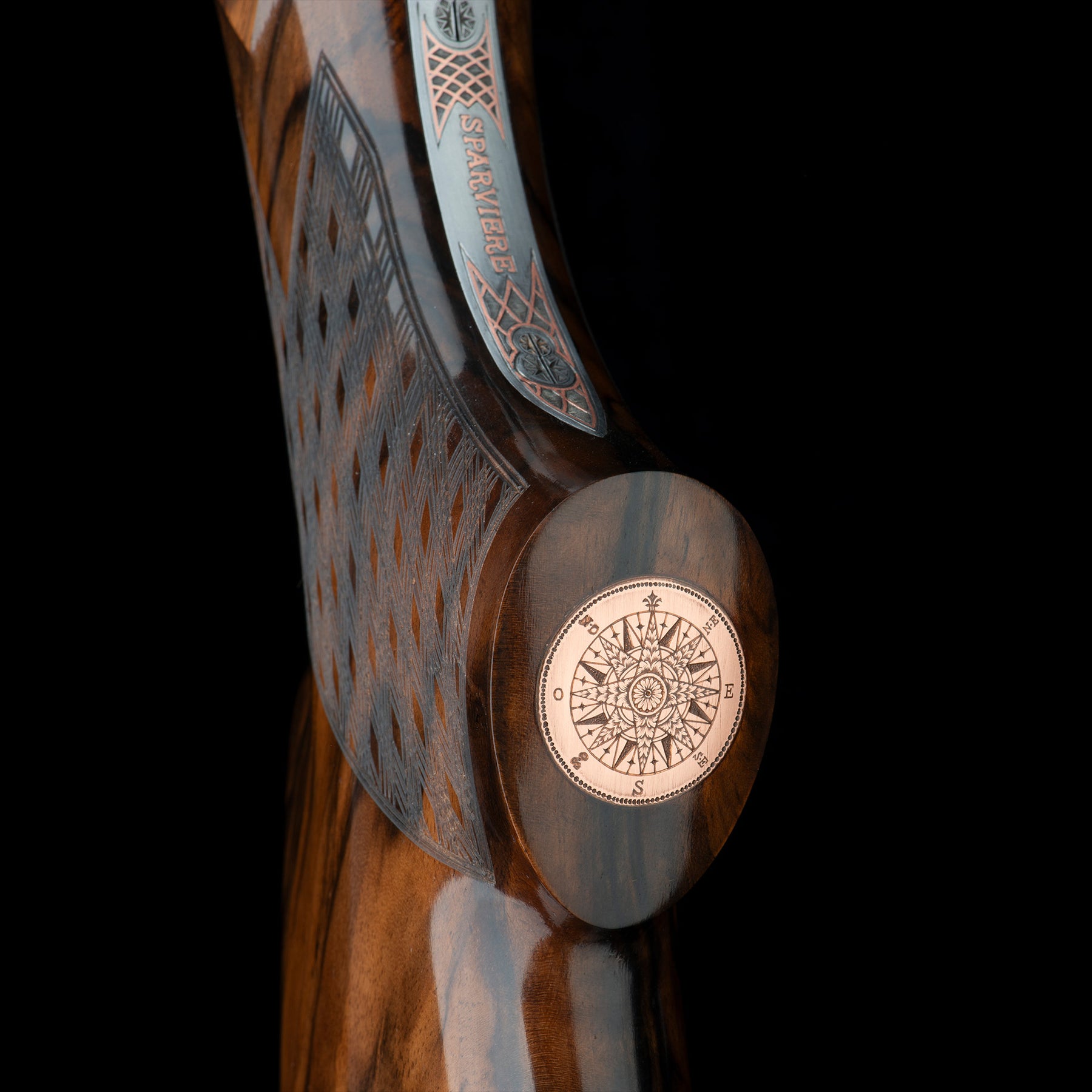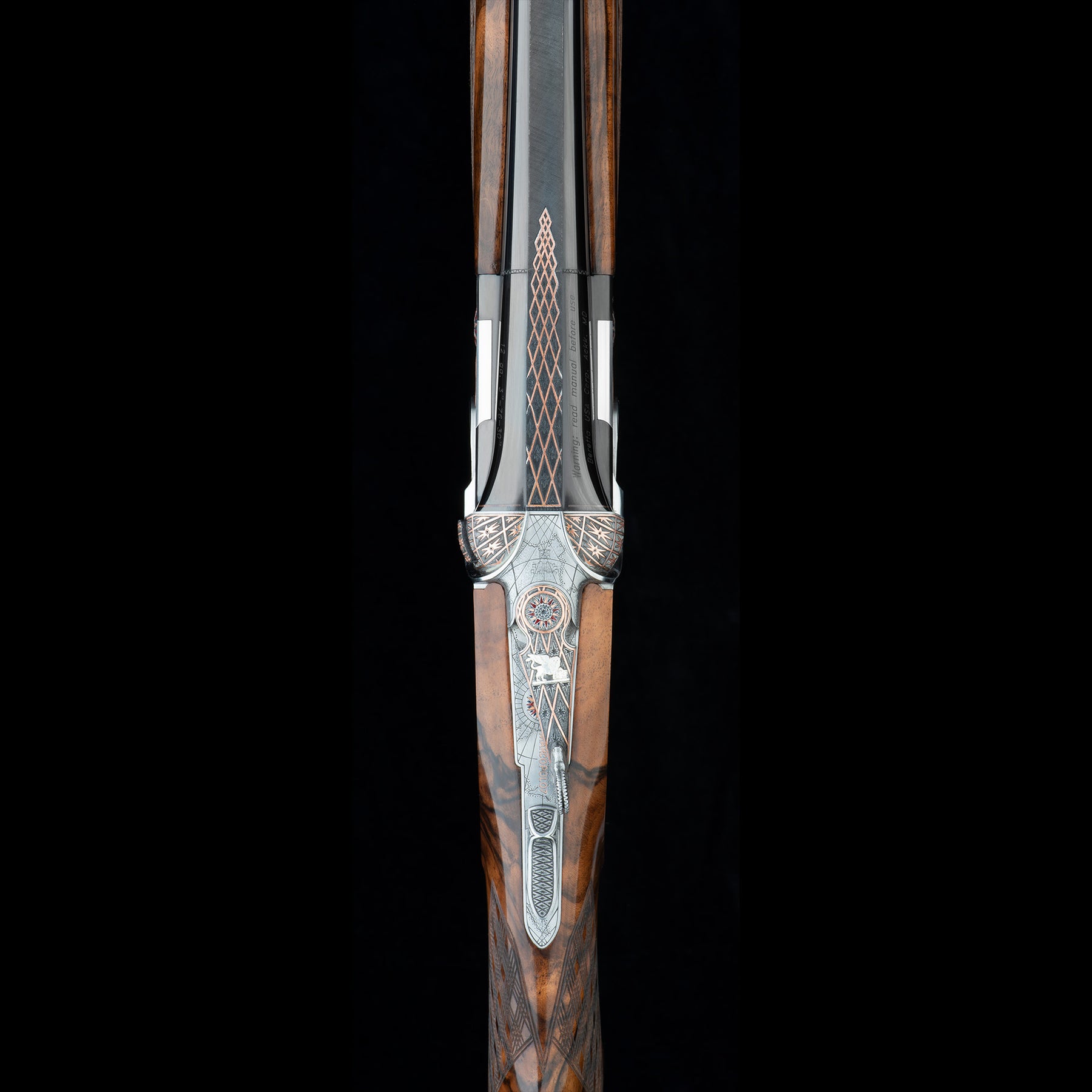 The SO Sparviere system includes hand-detachable sideplates that open simultaneously for inspection and maintenance. Internally, the mechanism is decorated to match the exterior artistry. A cross-bolt locking system ensures reliable performance, while the Steelium® Optimabore® HP barrels deliver exceptional shot patterns, reduced recoil, and hand-burnished visual finish.
