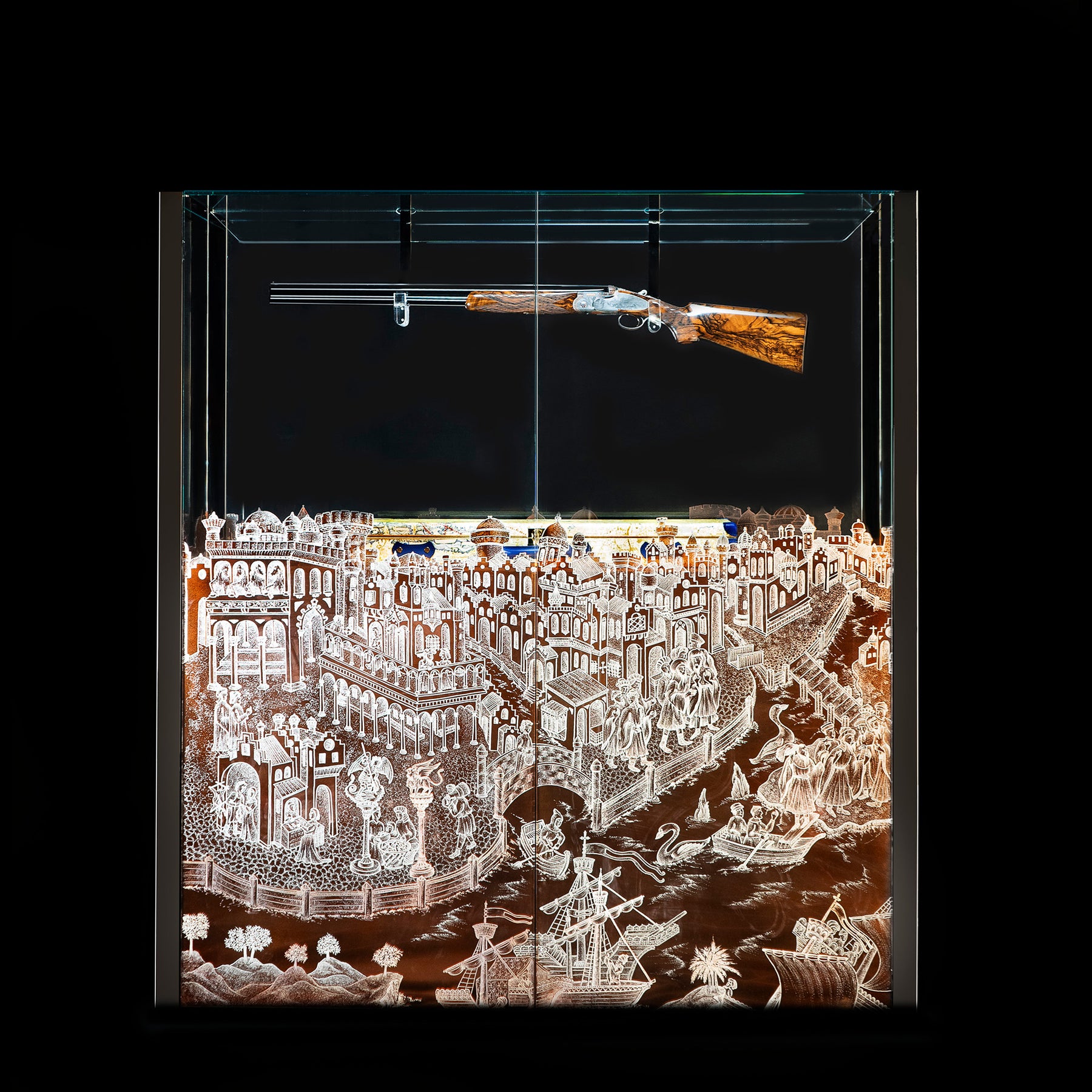 Housed in a yellow leather case printed with Fra' Mauro’s 1450 map, this piece is as travel-inspired as its namesake. The interior is lined in Venetian red silk with golden rose motifs. For exhibition, a custom wood and glass cabinet by Arte Veneziana—crafted in Murano—displays the shotgun amidst hand-engraved and silvered glass panels depicting Polo’s journey.