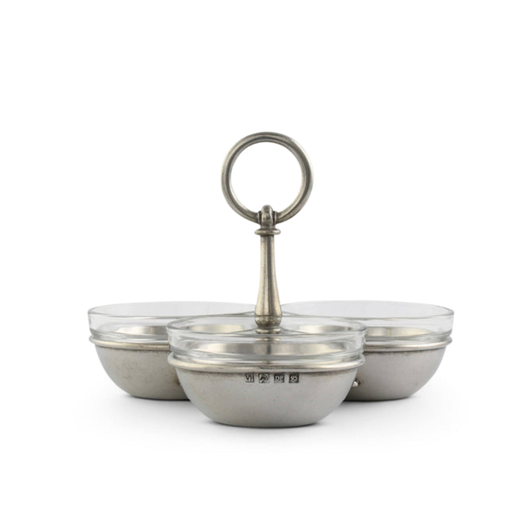 Hand-cast pewter condiment set featuring three vessels for serving oils, vinegars, spreads, and sauces. VAGABOND HOUSE's artisanal craftsmanship delivers refined tableware that develops character with use, suitable for everyday dining and special occasions alike.