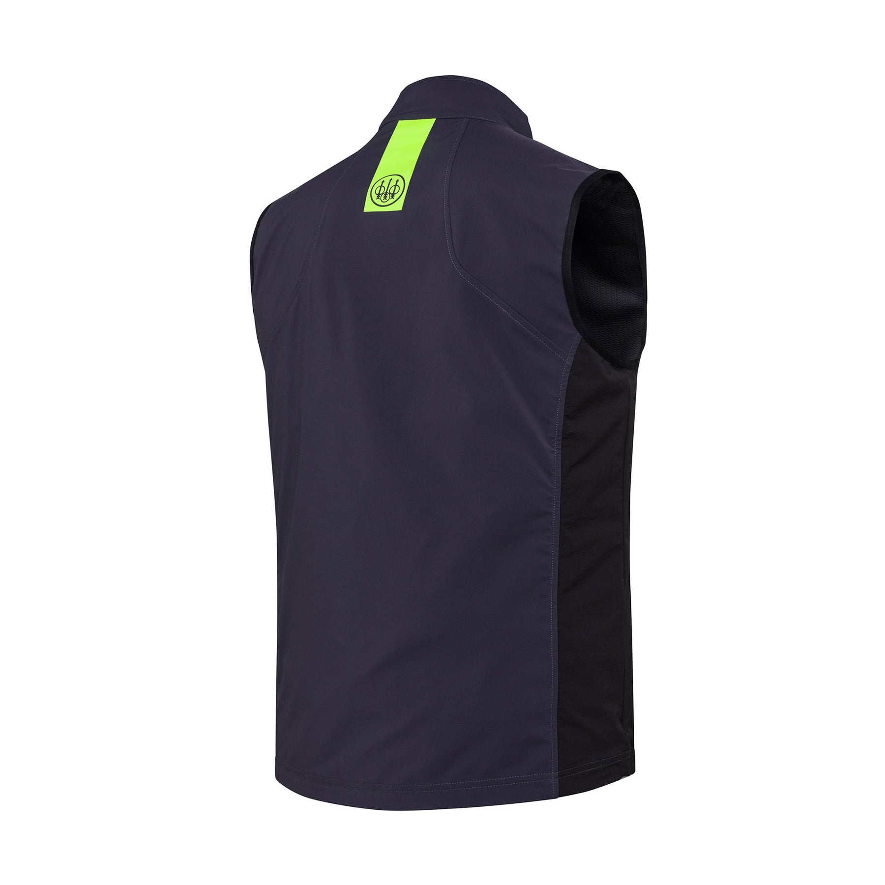 Lightweight polyester wind shell with water-repellent DWR finish and elastic side panels for comfort. Features central YKK zip, multiple zippered pockets, and adjustable drawstring hem. Regular fit with Beretta branding.